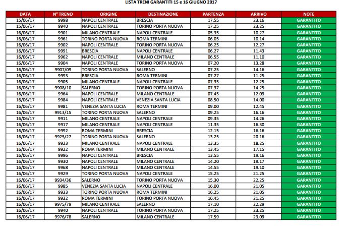 Per quanto riguarda Italo ecco la lista dei treni garantiti: