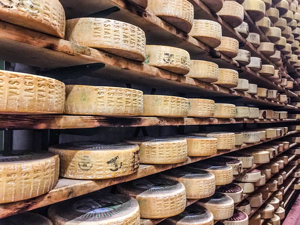 Durante la visita al Caseificio Pennar -che lascerebbe stupefatto chiunque- cerchiamo di capire come si possa produrre questo formaggio così particolare e buono. Prima di tutto la nostra guida ci spiega che l’Asiago DOP viene prodotto solamente d’estate. Le vacche passano l’inverno nelle stalle, dove mangiano fieno e producono più latte. Inevitabilmente però risulta meno saporito, sia a causa dell’umore dell’animale che del cibo che si trova a mangiare. Con questo latte il caseificio produce grandi quantità di Grana Padano, mentre è durante l’estate -l’erba è fresca ed il formaggio di conseguenza più giallo- che viene prodotto l’Asiago Pressato. La tecnica è piuttosto complicata e si caratterizza per l’assenza di sprechi ed un’attenta stagionatura.