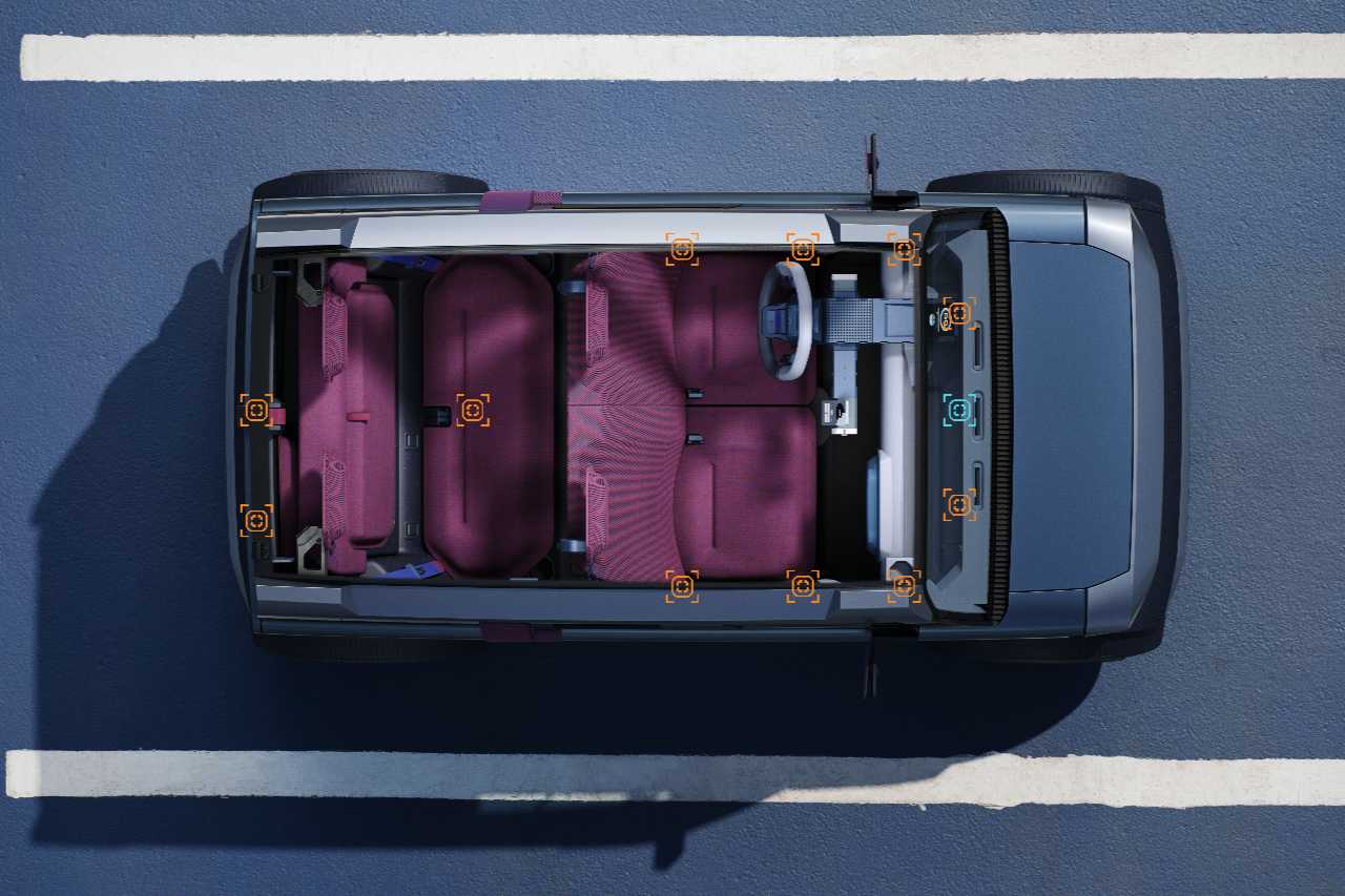I sedili sono frutto di un lavoro di progettazione mirato a unire ergonomia, semplicità e leggerezza. La struttura resta a vista, abbinata a un tessuto tecnico a maglia dal look caldo e funzionale. La panchetta anteriore unica richiama le vetture popolari del passato, mentre i poggiatesta traforati consentono di ottimizzare ulteriormente il peso complessivo.