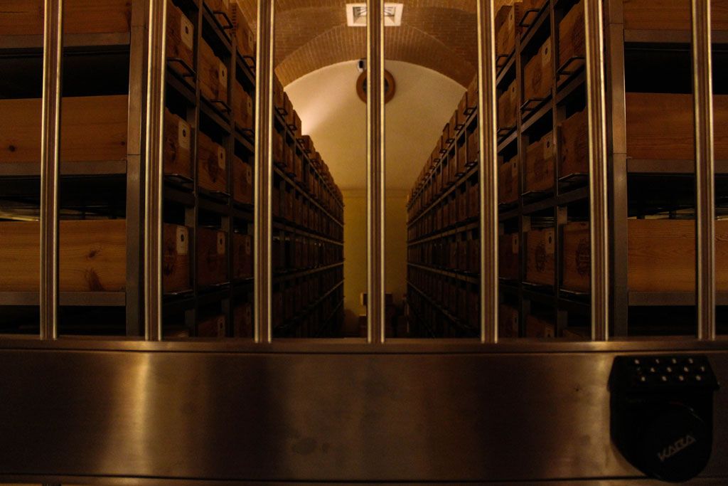 Notiamo delle lunghe sbarre d’acciaio con una porta a codice numerico, oltre alla quale riusciamo ad intravedere una quantità sconfinata di cassette in legno.