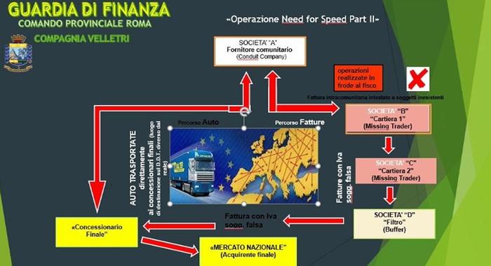 L’organizzazione aveva costruito una fitta rete di società fantasma e posto in essere un enorme giro di fatture false, per importare autovetture di grossa cilindrata, frodare l’Iva e ottenere più ampi guadagni nella rivendita delle autovetture. Need for Speed II” […] ha visto l’utilizzo e l’emissione di fatture per operazioni inesistenti per un imponibile complessivo di oltre 60 milioni di euro, una conseguente IVA evasa per oltre 14 milioni di euro (importo correlato al sequestro) e generato un illecito giro d’affari, tra le decine di imprese operanti su tutto il territorio nazionale interessate alla vicenda giudiziaria, di oltre 600 milioni di euro.