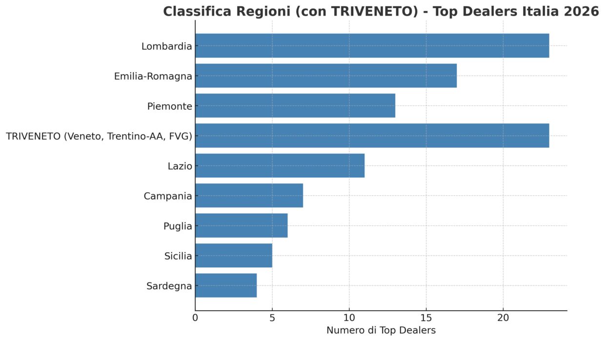 I Top Dealers lombardi incarnano i valori del progetto: eccellenza gestionale, trasparenza, digital transformation e capacità di anticipare trend come elettrificazione, servizi finanziari integrati, mobilità flessibile e data-driven retail. La regione conferma quindi il suo ruolo di laboratorio nazionale per modelli distributivi avanzati, dove tradizione imprenditoriale e modernità convivono. Con un mix unico di storicità, organizzazione industriale e spirito competitivo, la Lombardia continua a essere il punto di riferimento per chi vuole capire dove va l’automotive italiano.