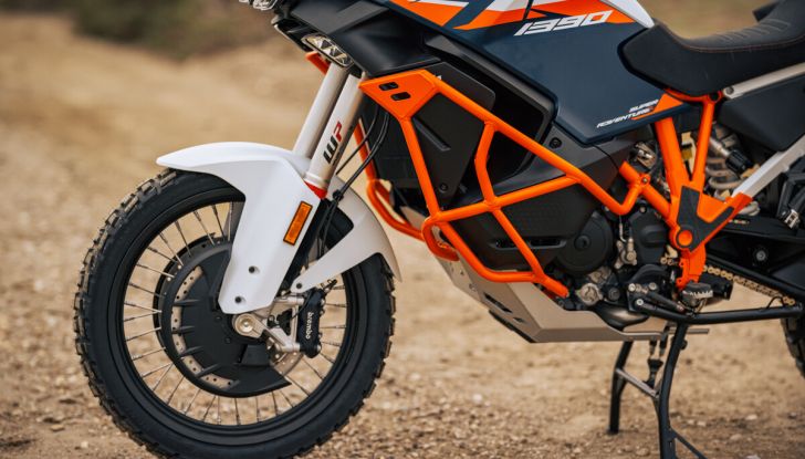 L’estetica della 1390 Super Adventure R è stata aggiornata con nuove linee muscolose e aggressive, abbinate a grafiche inedite che esaltano l’identità del marchio. I fianchi ospitano spoiler e sagomature ridisegnati per garantire maggiore comfort nella guida su strada e fuoristrada. A colpire è soprattutto il gruppo ottico anteriore full-LED, affiancato da faretti cornering che illuminano l’interno curva in piega, migliorando la visibilità in ogni condizione.