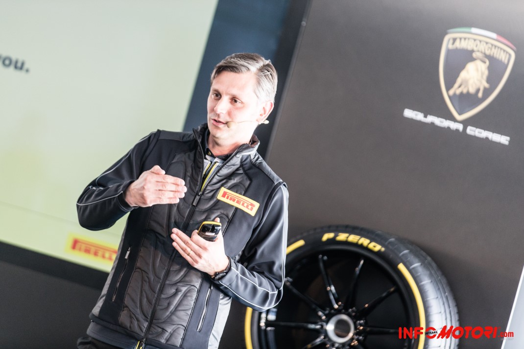 Proprio in occasione dell’incontro monzese Pirelli, da sempre azienda leader nella fornitura di pneumatici nell’ambito sportivo, ha illustrato alla stampa locale alcuni prodotti frutto della ricerca costante sia in ambito sportivo sia in ambito stradale. Mario Isola, Motorsport Racing Manager, ci spiega che la chiave del grande successo di Pirelli degli ultimi anni è da ricercarsi nel costante dialogo che avviene in tutti i livelli aziendali: dal reparto che si dedica alla produzione di pneumatici per la Formula 1 fino al reparto che è dedicato ai pneumatici stradali che contempla oggi tutta una serie di prodotti di assoluta qualità quali la gamma PZero, PZero Corsa e la nuova mescola PZero Trofeo R, uno pneumatico progettato per essere ancora più performante nell’equipaggiamento delle vetture più potenti, come appunto Lamborghini con la quale collabora dal lontano 1963 per equipaggiare, sin dalla fabbrica, le vetture.